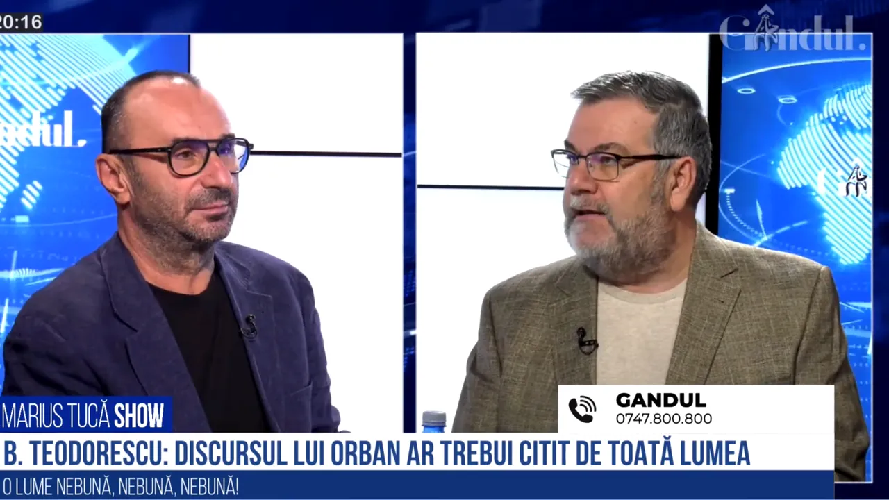 Bogdan Teodorescu, analist politic, a fost invitatul lui Marius Tucă într-o ediție transmisă live de Gândul. Politologul a vorbit despre discursurile publice ale premierului maghiar, Viktor Orban, atât la Școala de Vară de la Băile Tușnad, cât și în Texas, la întâlnirea cu fostul președinte american, Donald Trump. Invitatul lui Marius Tucă este de părere că, deși tipul de discurs al prim-ministrului Ungariei este bine construit, el nu promovează democrația și „nu există nici un singur cuvânt negativ în legătură cu Rusia”.