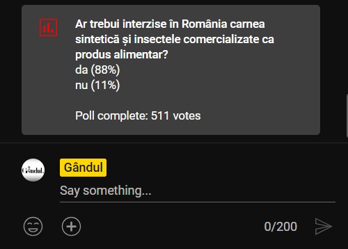 Astfel, cei mai mulți dintre români sunt de părere că se impune interzicerea comercializării cărnii sintetice și a insectelor ca produs alimentar.