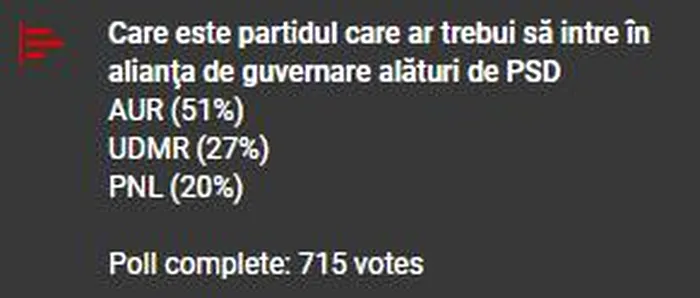 Telespectatorii emisiunii „Marius Tucă Show” au fost invitați să participe la poll-ul ediției de marți, 22 octombrie 2024, fiind propusă următoarea întrebare: „Care este partidul care ar trebui să intre în alianța de guvernare alături de PSD ”.