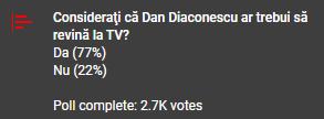 A fost propusă următoarea întrebare: „Considerați că Dan Diaconescu ar trebui să revină la TV?”.