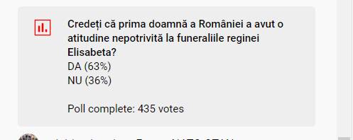 Majoritatea celor care au răspuns la poll-ul „Marius Tucă Show” (63%) sunt de părere că prima doamnă a avut o atitudine nepotrivită la funeraliile reginei Elisabeta, în timp ce doar 36% dintre respondenți consideră că modul în care s-a prezentat Carmen Iohannis a fost adecvat.