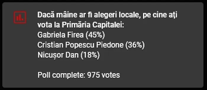 Iată ce au răspuns votanții: GABRIELA FIREA (45%), Cristian Popescu Piedone (36%) și Nicușor Dan (18%).