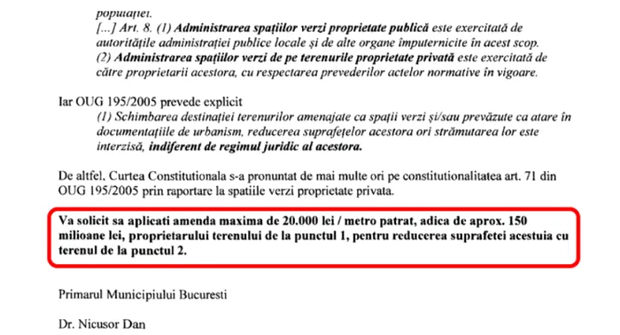 Cu toate că i s-a transmis că amenda de 35 de milioane de euro nu poate fi aplicată, întrucât cartea funciară specifica foarte clar că terenurile sunt încadrate la categoria „Curți-construcții”, Nicușor Dan a cerut redactarea amenzii pentru „diminuarea suprafeței spațiului verde, pentru aproximațiv 7.500 mp, cu amenda maximă de 20.000 lei pe mp”.