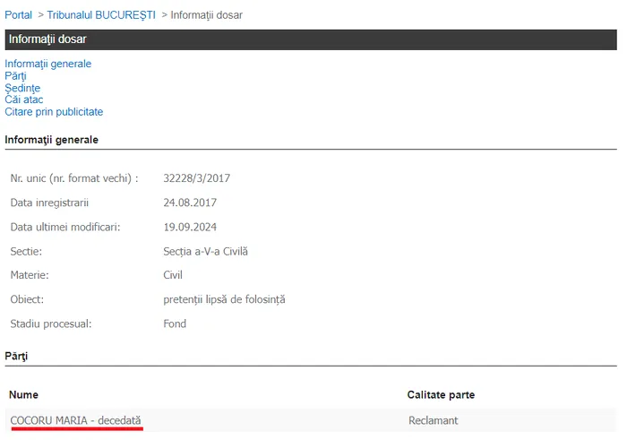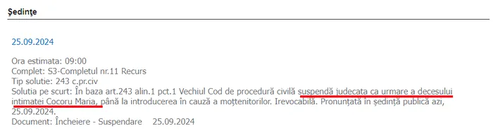 Într-un alt proces în care Maria Cocoru avea calitatea de reclamant, magistrații de la Tribunalul București care îi judecau cererea au fixat ca termen de judecată data de 3 decembrie 2024, având în vedere decesul acesteia. Dacă până la acea dată nu se face dovada succesorilor Mariei Cocoru, instanța poate da un nou termen de judecată.