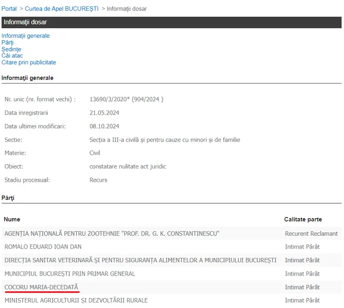 Maria Cocoru era intimat pârât într-un dosar civil care avea ca obiect constatarea nulității unui act juridic. Partea reclamantă în dosar este Agenția Națională pentru Zootehnie „Prof. Dr. G. K. Constantinescu”.