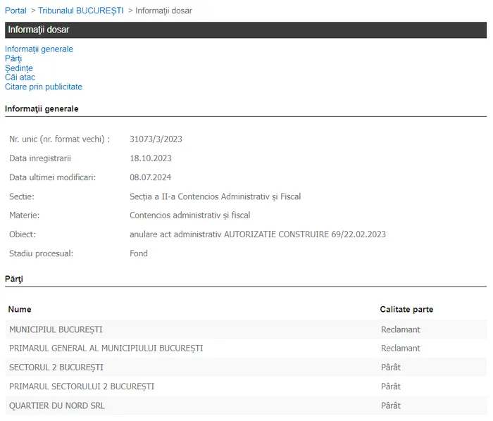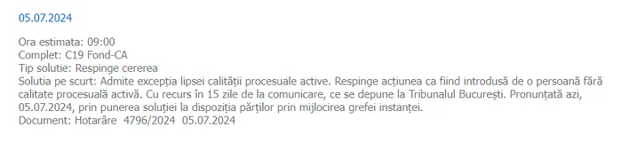 „Tip soluție: Respinge cererea. Soluția pe scurt: Admite excepţia lipsei calităţii procesuale active. Respinge acţiunea ca fiind introdusă de o persoană fără calitate procesuală activă. Cu recurs în 15 zile de la comunicare, ce se depune la Tribunalul Bucureşti. Pronunţată azi, 05.07.2024, prin punerea soluţiei la dispoziţia părţilor prin mijlocirea grefei instanţei. Document: Hotarâre 4796/2024 05.07.2024”, au decis magistrații de la Tribunalul București.