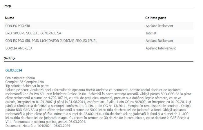 „Anulează apelul formulat de apelanta Borcia Andreea ca netimbrat. Admite apelul declarat de apelanta-reclamantă Con Ex Pro SRL prin lichidator Prolex IPURL. Schimbă în parte sentinţa atacată.