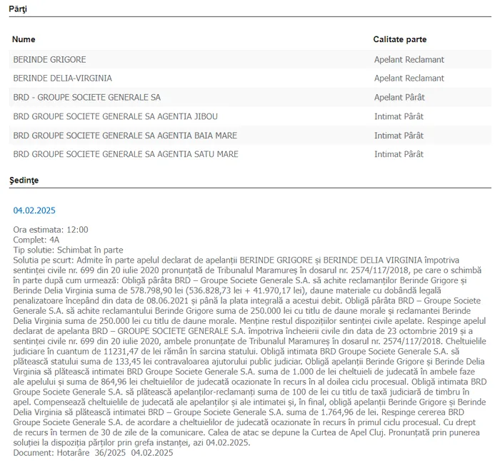 În luna februarie a anului 2025, magistrații de la Curtea de Apel Cluj au decis ca BRD – Groupe Société Générale SA să plătească daune materiale într-un proces care are ca obiect „acțiune în răspundere delictuală”.