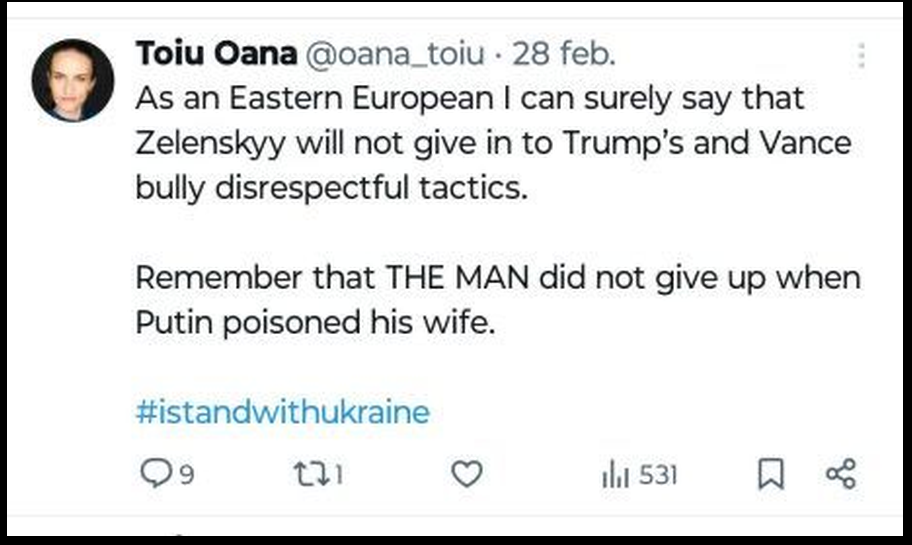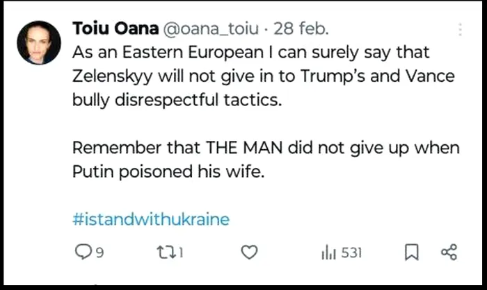 În luna februarie, Oana Țoiu a scris în mediul online că Trump și Vance l-au supus pe Zelenski unor tactici de intimidare lipsite de respect și, mai mult, a reluat tema potrivit căreia Putin ar fi ordonat otrăvirea soției președintelui ucrainean.