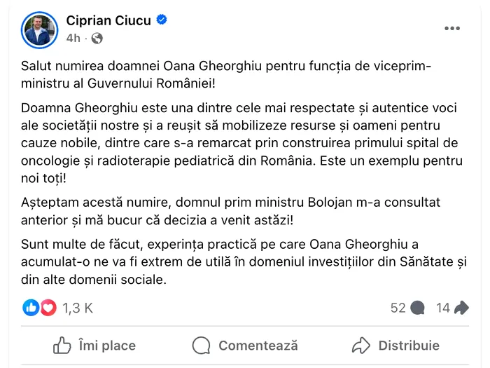 Sunt multe de făcut, experința practică pe care Oana Gheorghiu a acumulat-o ne va fi extrem de utilă în domeniul investițiilor din Sănătate și din alte domenii sociale”, a scris Ciprian Ciucu pe Facebook.