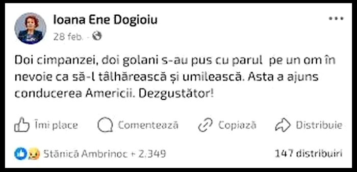 În aceeași zi – 28 februarie 2025 – Ioana Ene Dogioiu, actual purtător de cuvânt al guvernului condus de Ilie Bolojan (începând din luna iulie), scria că Donald Trump și JD Vance „s-au pus cu parul pe om”, cu referire la Volodimir Zelenski.