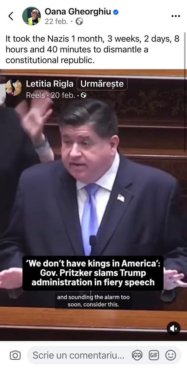 „A fost nevoie de naziști 1 lună, 3 săptămâni, 2 zile și 8 ore și 40 de minute pentru a demonta o republică constituțională”, a scris Oana Gheorghiu în data de 22 februarie.