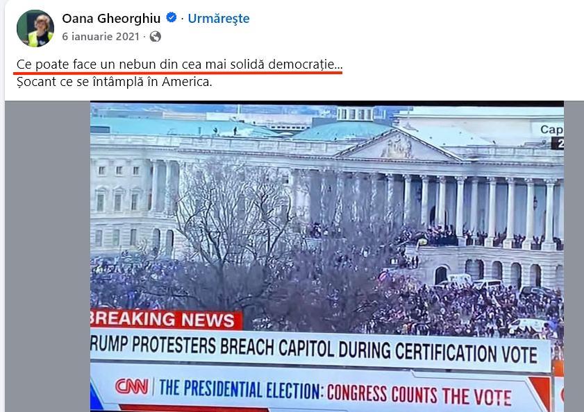 Tot în anul 2021, în timpul protestelor din SUA, de la Capitoliu, Oana Gheorghiu l-a luat din nou la țintă pe Donald Trump.