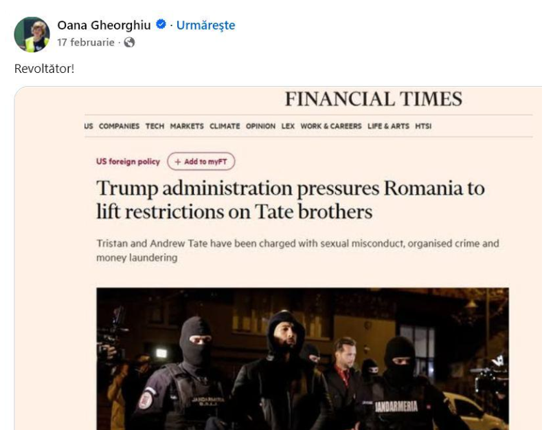 Oana Gheorghiu s-a declarat „revoltatată” pe pagina sa de socializare pe data de 17 februarie, pentru că – potrivit Finacial Times – administrația Trump ar fi pus „presiune” pe România pentru a ridica restricțiile impuse fraților Tate.