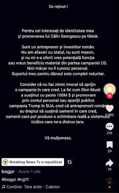 ”Pentru cei interesați de identitatea mea și promovarea lui Călin Georgescu pe Tiktok. Sunt un antreprenor și investitor român. Nu am afaceri cu statul, nu sunt mason și nu mi s-a oferit vreo potențială funcție sau vreun beneficiu material din partea campaniei CG. Nici măcar nu îl cunosc personal. Suportul meu pentru dânsul este complet voluntar. Consider că nu fac nimic imoral să sprijin o campanie în care cred. La fel cum Elon Musk a susținut cu peste 100 milioane de dolari și promovare prin contul personal sau apariții publice campania Trump în SUA. Cred că antreprenorii români au dreptul să susțină oamenii în care cred, oamenii care pot produce o schimbare reală a sistemului ticălos care ne-a distrus țara. Vă mulțumesc!”
