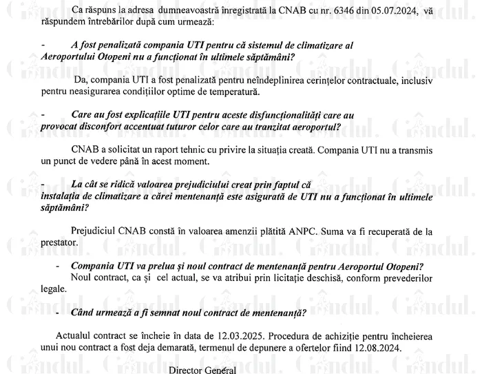 În exclusivitate, CNAB transmis că, în urma acestei defecțiuni la sistemul de ventilație, UTI a fost penalizată „pentru neîndeplinirea cerințelor contractuale, inclusiv pentru neasigurarea condițiilor optime de temperatură” la Aeroportul „Henri Coandă”.