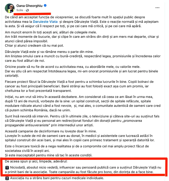 „Spun și aici, limpede, adevărul: Niciodată, absolut nicio vedetă, influencer sau persoană publică care a susținut Dăruiește Viață nu a primit bani de la asociație. Toate campaniile au fost făcute pro bono, din dorința de a face bine”, a scris Oana Gheorghiu pe pagina de Facebook, după numirea sa ca vicepremier în Guvernul României.