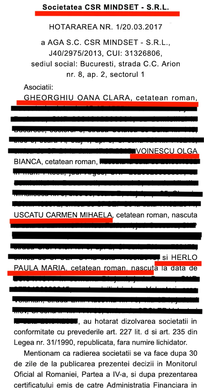 Firma CSR Mindset SRL a fost înființată în 2013 de Oana Gheorghiu, Carmen Uscatu, Bianca Olga Voinescu și Paula Maria Herlo ca o societate care are ca principale domenii consultanța în management, relațiile publice și comunicarea.