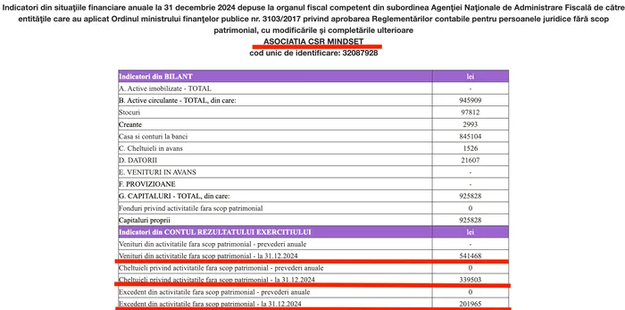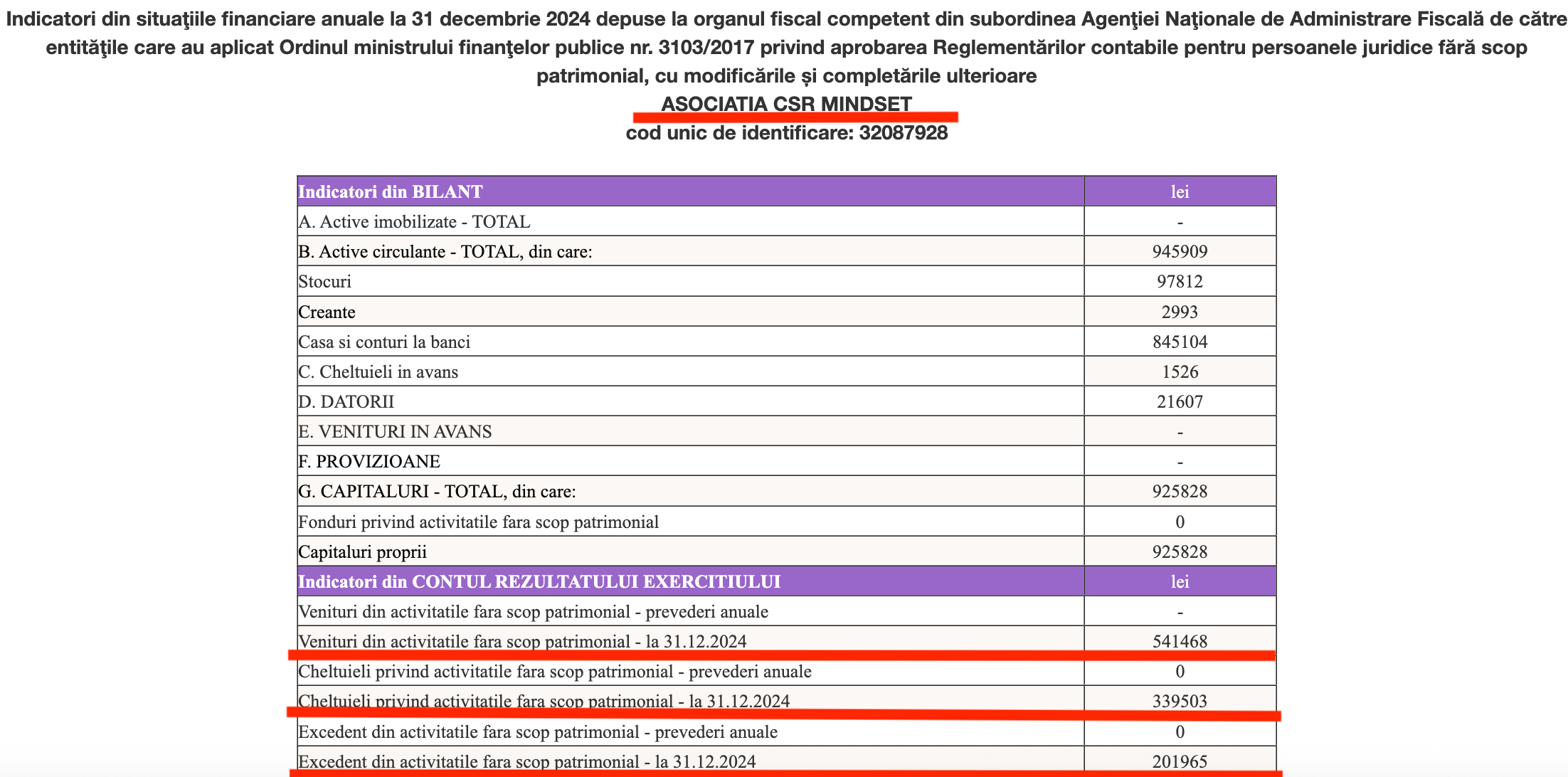 UPDATE. Doamna Oana Gheorghiu ne-a transmis un drept la replică prin care a precizat că suma de 201.965 de lei ( 40.393 Euro ), identificată în actele financiare ale Asociației CSR MINDSET reprezintă în realitate excedent din activitățile fară scop patrimonial și nu profit, această asociație fiind o asociatie non-guvernamentala, fără scop lucrativ, deci care nu poate genera profit.