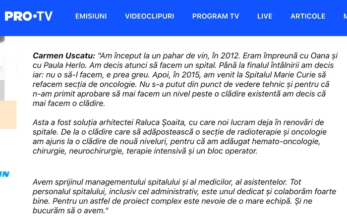 Într-un interviu acordat ProTV și semnat „Redacția”, Carmen Uscatu mărturisește că a început demersul „noi facem un spital” – la un pahar de vin: „Am început la un pahar de vin, în 2012. Eram împreună cu Oana și cu Paula Herlo. Am decis atunci să facem un spital. Până la finalul întâlnirii am decis iar: nu o să-l facem, e prea greu