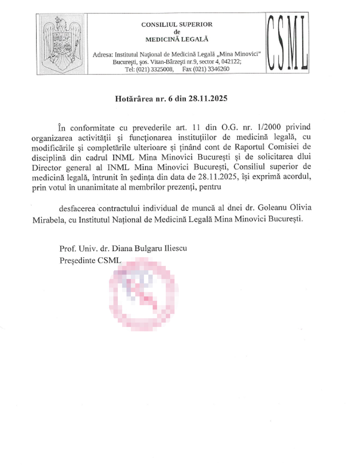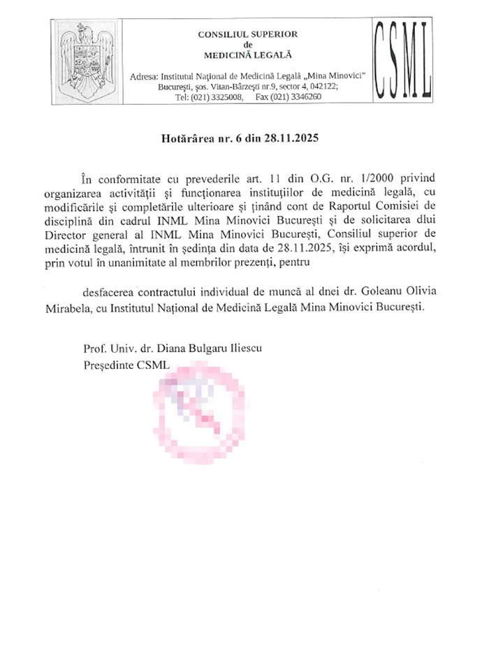 „În conformitate cu prevederile art. 11 din O.G. nr. 1/2000 privind organizarea activităţii şi funcţionarea instituţiilor de medicină legală, cu modificările și completările ulterioare și ținând cont de Raportul Comisiei de disciplină din cadrul INML Mina Minovici București și de solicitarea dlui Director general al INML Mina Minovici București, Consiliul superior de medicină legală, întrunit în ședința din data de 28.11.2025, își exprimă acordul, prin votul în unanimitate al membrilor prezenți, pentru desfacerea contractului individual de muncă al dnei dr. Goleanu Olivia Mirabela, cu Institutul Național de Medicină Legală Mina Minovici București”, se arată în decizie.