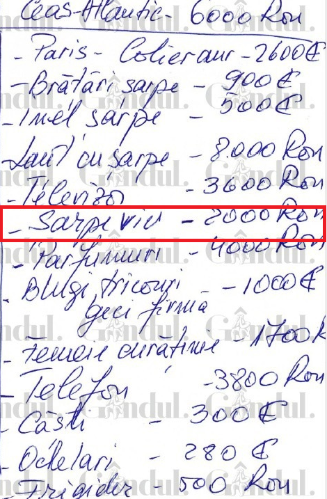Pentru ca totul să fie de-a dreptul halucinant, Fănel Ignat mai spune la Antena 3 că nu a făcut cadouri și că este vorba despre „afirmații mincinoase”, deși Gândul a prezentat, în exclusivitate, lista întocmită chiar de el, una în care preciza, punctual, toate cadourile făcute amantei Z.C., inclusiv un șarpe viu, plus prețurile aferente.
