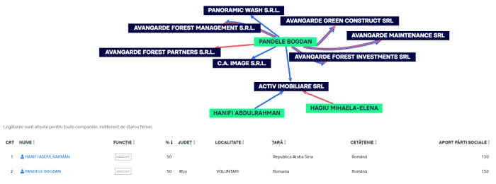 Bogdan Pandele, fiul lui Florentin Pandele, primarul din Voluntari, se află în centrul unei adevărate rețele de firme, iar una dintre acestea, ACTIV IMOBILIARE SRL, este ”conectată” la afacerile familiei Hanifi.