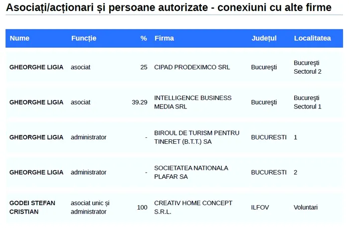 În ceea ce privește conexiunile cu alte firme, Ligia Gheorghe, consiliera Gabrielei Firea, apărea în calitate de asociat la alte două firme – CIPAD PRODEXEIMCO SRL și INTELLIGENCE BUSINESS SRL – și în calitate de administreator la alte două firme: Biroul de Turism pentru Tineret (BTT) SA și Societatea Națională Plafar SA.