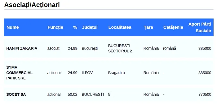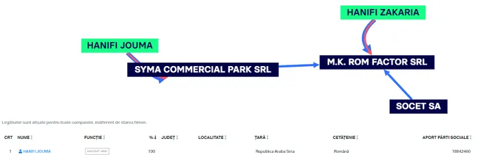 Potrivit termene.ro, M.K. Rom Factor are, acum, un asociat – Zakaria Hanifi – și doi acționari, două societăți comerciale, SYMA COMMERCIAL PARK, deținută tot de familia Hanifi și SOCET SA.