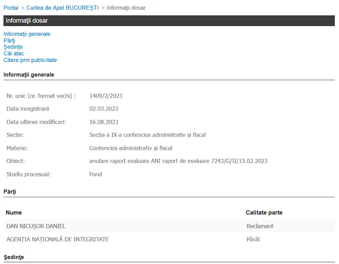 „Soluția in dosarul nr. 1409/2/2023: admite excepția tardivității formulării cererii adiționale și constata decăzut reclamatul din dreptul de a invoca noi motive de nelegalitate. Admite excepția inadmisibilității exercitării controlului de legalitate asupra dispoziției din raportul de evaluare prin care a fost sesizat Parchetul de pe lângă Înaltă Curte de Casație și Justiție. Respinge cererea de anulare cu privire la acest aspect ca inadmisibila. Admite in parte cererea formulata de reclamantul Nicușor Daniel Dan in contradictorii cu pârâta Agenția Naționala de Integritate. Anulează in parte raportul de evaluare nr. 58231/G/II/ 23.12.2022 sub aspectul constatării existentei stării de incompatibilitate și conflictului de interese. Cu recurs in termen de 15 zile de la comunicare, recursul se depune la Curtea de Apel Bucuresti. Pronunțată astăzi, 21.09.2023, solutia fiind pusa la dispoziția părților prin mijlocirea grefei”, este minuta ședinței de joi de la Curtea de Apel București.