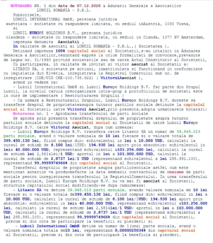 Având în vedere evoluția nefavorabilă a dosarului LUKOIL, în data de 07.12.2020 Grupul Lukoil a decis “reorganizarea intra-grup a portofoliului de societăți”, mutând benzinăriile și restul activelor Lukoil România de la acționarul majoritar Lukoil Europe Holding BV Olanda la Litasco SA, altă firmă din grupul Lukoil (publicată în Monitorul Oficial nr. 0245/20.01.2021).
