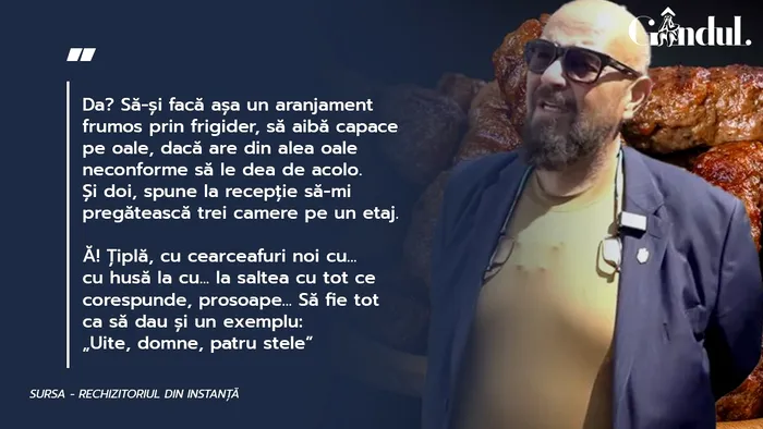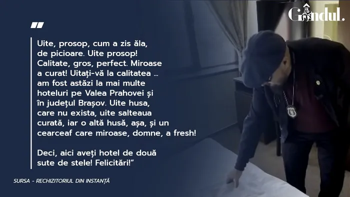 – Popescu Cristian Victor Piedone: E, o să vedeți astăzi și mâine și poimâine, să vedeți ce hoteluri de patru stele poate să existe pe Valea Prahovei sau pe județul Brașov. Vă luați cu mâinile de cap! Deci, aici aveți hotel de două sute de stele! Felicitări!”, spune Cristian Popescu Piedone, potrivit rechizitoriului aflat în instanță, din care Gândul prezintă extrase în exclusivitate.