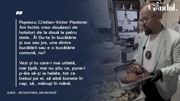 – Popescu Cristian-Victor Piedone: Am închis vreo douăzeci de hoteluri de la două la patru stele… Ă! Du-te în bucătărie și sus sau jos, una dintre bucătării sau e o bucătărie comună, nu?
