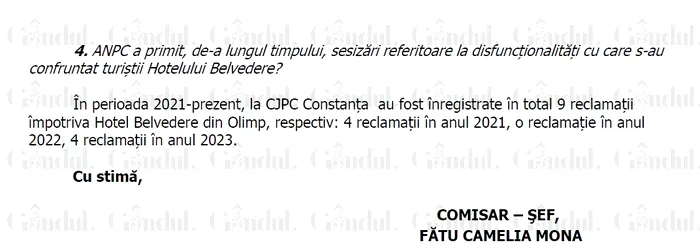 „În perioada 2021 – prezent, la CJPC Constanța au fost înregistrate în total 9 reclamații împotriva Hotelului Belvedere din Olimp, respectiv: 4 reclamații în anul 2021, o reclamație în anul 2022, 4 reclamații în anul 2023”, a precizat comisarul șef Mona Camelia Fătu.