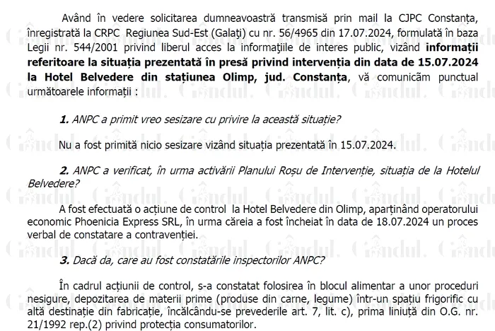 La solicitarea Gândul, ANPC – Comisariatul Regional pentru Protecția Consumatorilor (CRPC), Regiunea Sud-Est Galați – a transmis, în exclusivitate, că a fost efectuată o „acțiune de control” la Hotelul Belvedere, în urma activării Planului Roșu de Intervenție.