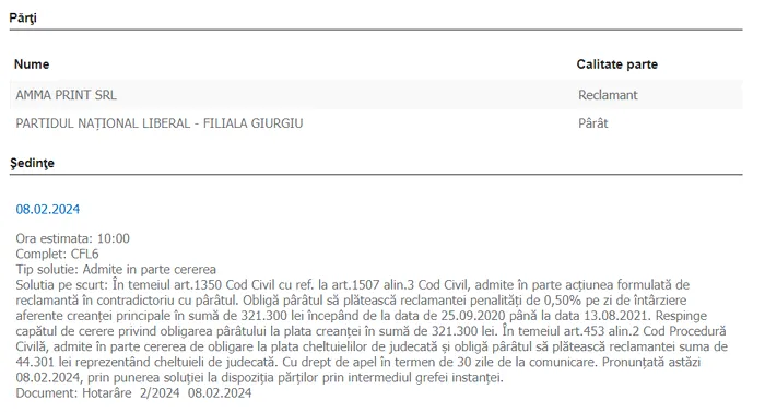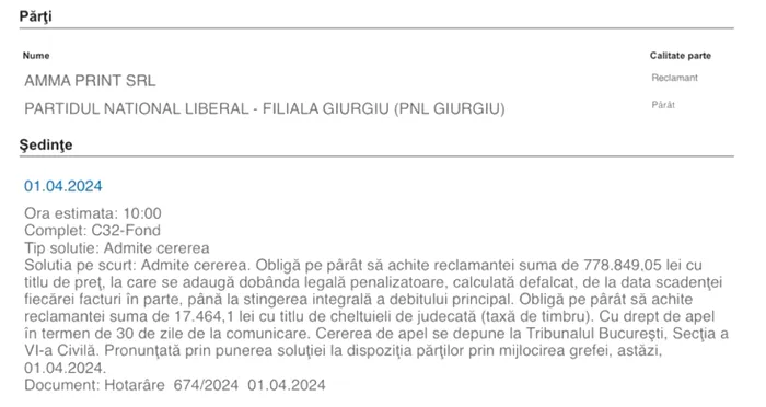 AMMA Print a cerut daune, iar instanța le-a dat dreptul, în 8 februarie 2024, să obțină 0,5% pentru suma datorată de PNL Giurgiu și neplătită la timp, plus cheltuieli de judecată de peste 44.000 de lei.