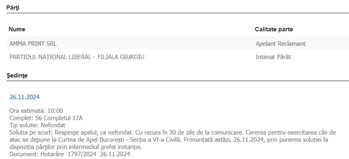În 10 decembrie 2024, magistrații de la Curtea de Apel București (CAB) au respins, ca nefondat, apelul formulat de PNL – filiala Giurgiu.