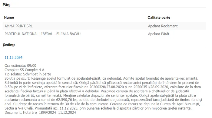 În 11 decembrie 2024, magistrații de la Curtea de Apel București au respins, ca nefondat, apelul formulat de PNL – Filiala Bacău, în procesul cu aceeași firmă AMMA Print