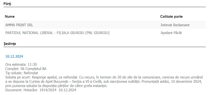 PNL Giurgiu mai are însă o șansă în acest dosar, pentru că cererea firmei AMMA Print va ajunge la Înalta Curte de Casație și Justiție, unde se va da decizia definitivă.