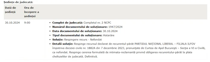 „Respinge recursul declarat de recurentul-pârât Partidul Național Liberal – Filiala Ilfov împotriva deciziei civile nr. 1882A din 7 decembrie 2023, pronunţată de Curtea de Apel Bucureşti – Secţia a VI-a Civilă, ca nefondat. Respinge cererea formulată de intimata-reclamantă privind obligarea recurentului-pârât la plata cheltuielilor de judecată. Definitivă”, au stabilit judecătorii ICCJ.