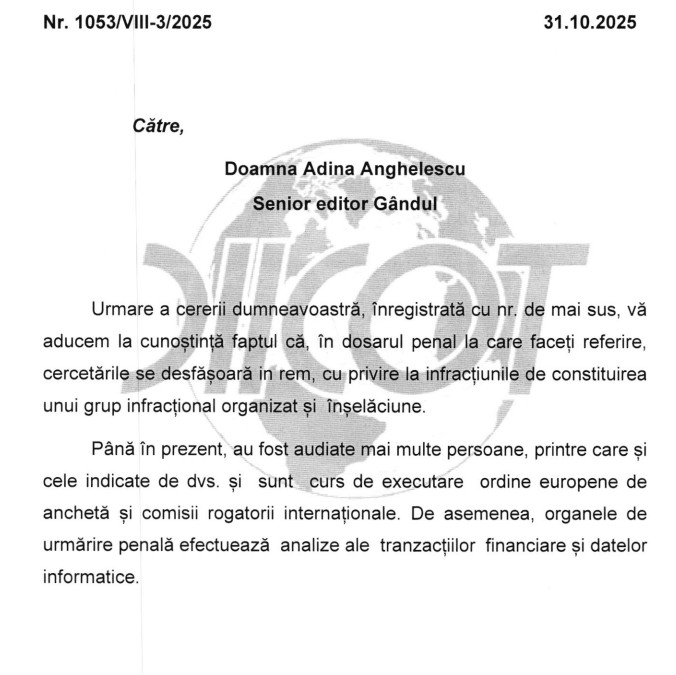 Mai mult, DIICOT a transmis pentru Gândul că „sunt în curs de executare ordine europene de anchetă şi comisii rogatorii internaţionale. De asemenea, organele de urmărire penală efectuează analize ale tranzacţiilor financiare şi datelor informatice’’.