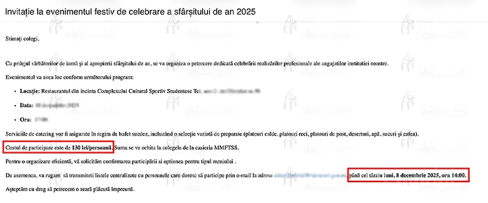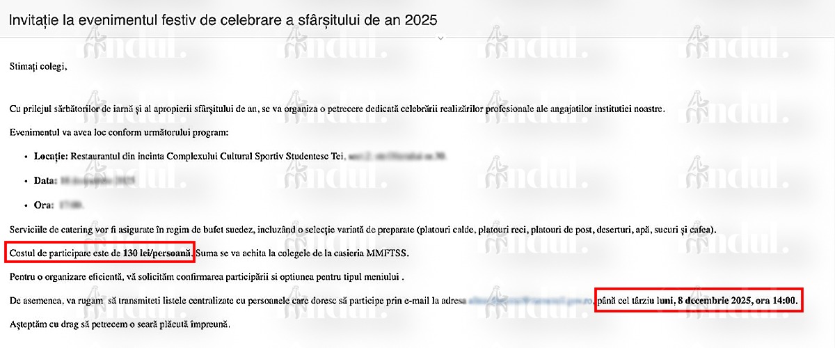 Cei din minister sunt încurajați să participe în număr cât mai mare, pentru că – nu-i așa? – nimic nu spune „Mulțumim pentru munca depusă în 2025” mai bine decât o petrecere în care recunoștința vine la pachet cu o taxă de participare.