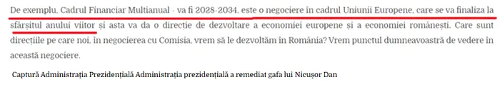 Șeful statului a adus în discuție „Cadrul Financiar Multianual”, un proiect derulat în perioada 2028-2034, despre care Nicușor Dan a adăugat că se va termina „anul trecut” așa cum arată și videoclipul transmisiei live de pe pagina oficială de YouTube a Administrației Prezidențială.