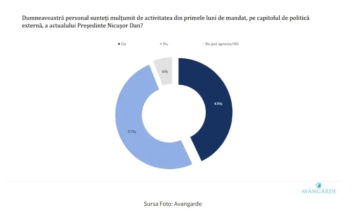 La doar câteva luni după preluarea mandatului, românii sunt deja critici la adresa activității președintelui Nicușor Dan pe plan extern, 51% dintre aceștia fiind nemulțumiți de prestația sa, potrivit unui sondaj realizat de Avangarde. Și mai grav, activitatea Ministerului Afacerilor Externe – condus de Oana Țoiu, vicepreședinte USR – este contestată de 51% dintre cei care au participat la acest sondaj de opinie, fiind aprobată doar de 38%.