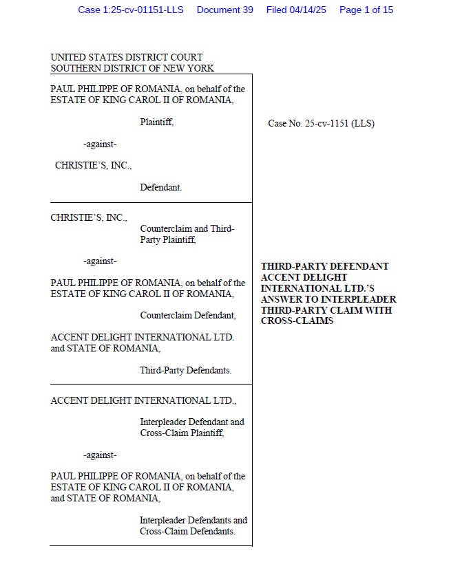 „În februarie 2025, Philippe și România au intervenit în mod necorespunzător pentru a împiedica Accent să vândă Sfântul Sebastian, o pictură a artistului „Maestru Vechi” din Renașterea spaniolă, Doménikos Theotokópoulos, cunoscut sub numele de El Greco („Pictura”). Accent achiziționase lucrarea în 2010 de la un comerciant de artă profesionist, cel mai recent dintre mai mulți proprietari care își au originea până la regele Mihai I al României. Accent a aflat ulterior că România i-a permis regelui Mihai I să ia pictura și altele cu el atunci când guvernul comunist l-a forțat să abdice de la tron în 1947”, se arată în dicuemntul depus.
