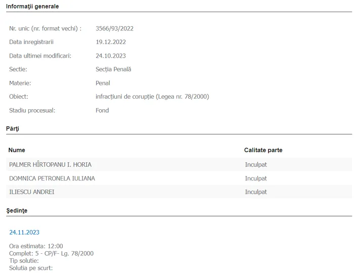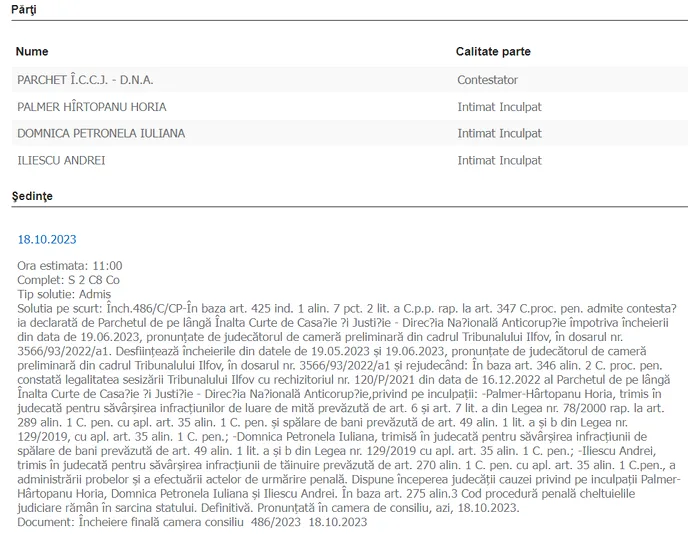 Dispune începerea judecăţii cauzei privind pe inculpaţii Palmer-Hîrtopanu Horia, Domnica Petronela Iuliana şi Iliescu Andrei. În baza art. 275 alin.3 Cod procedură penală cheltuielile judiciare rămân în sarcina statului. Definitivă. Pronunţată în camera de consiliu, azi, 18.10.2023. Document: Încheiere finală camera consiliu  486/2023  18.10.2023”, au decis magistrații Curții de Apel București.