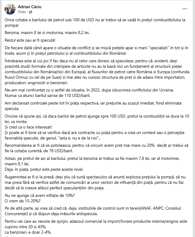 Adrian Câciu amintește că România s-a mai confruntat cu o situație asemănătoare în 2022, după izbucnirea conflictului din Ucraina, atunci când barilul depășise 110 dolari. Potrivit acestuia, la acel moment au fost declanșate controale ample în piață, iar prețurile au scăzut imediat după eliminarea practicilor speculative. De asemenea, Câciu soune că prețurile de la pompă sunt cu 20% mai mari decât ar trebui și consideră că prețul corect ar trebui să fie de maxim 7,8 lei pentru benzină și 8,1 lei pentru motorină.