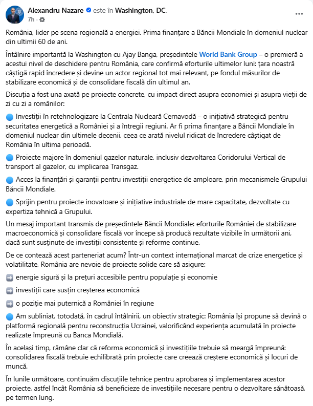 „România, lider pe scena regională a energiei. Prima finanţare a Băncii Mondiale în domeniul nuclear din ultimii 60 de ani. Întâlnire importantă la Washington cu Ajay Banga, preşedintele World Bank Group – o premieră a acestui nivel de deschidere pentru România, care confirmă eforturile ultimelor luni: ţara noastră câştigă rapid încredere şi devine un actor regional tot mai relevant, pe fondul măsurilor de stabilizare economică şi de consolidare fiscală din ultimul an”, a scris ministrul Finanţelor pe Facebook.