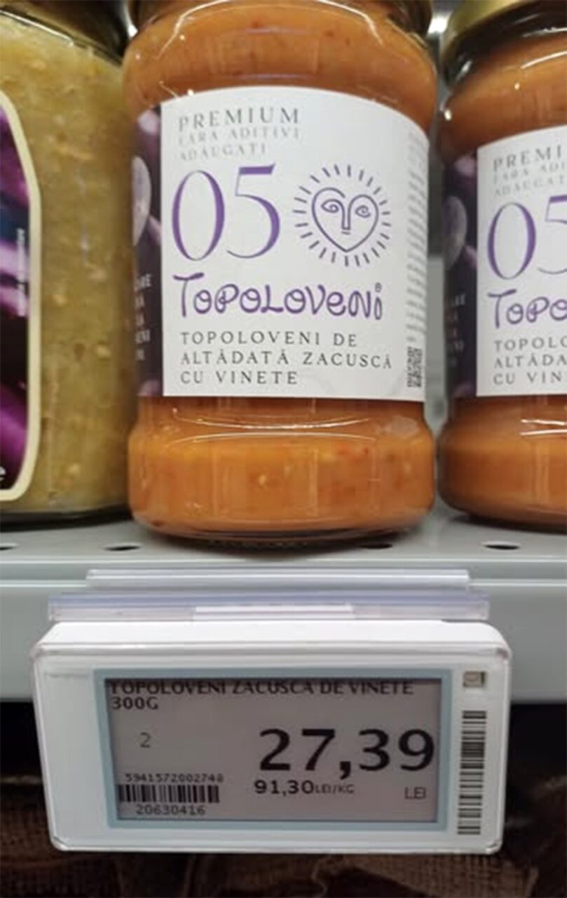 Dacă numai 300 de grame de zacuscă de vinete costă 27 de lei, un kilogram ar face acum 91 de lei. Produsul vizat este un borcan cu zacuscă de vinete „Topoloveni de altădată”. Este zacuscă naturală, preparată în România, fără conservanți!