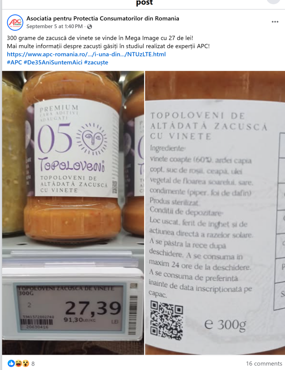 „300 grame de zacuscă de vinete se vinde în Mega Image cu 27 de lei! Mai multe informații despre zacuști găsiți în studiul realizat de experții APC!”.